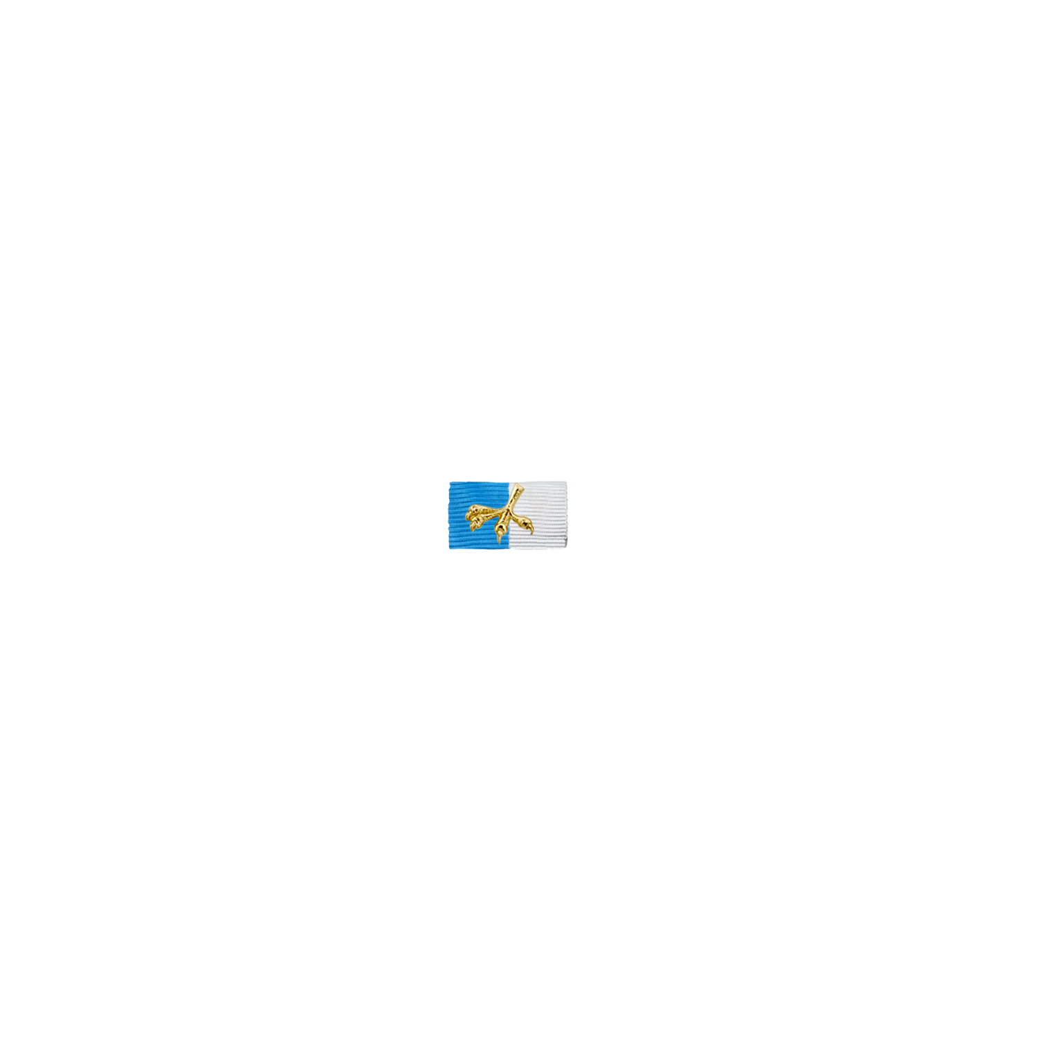 Bandspange, Blau-Weiß, ca. 25 x 12 mm, Messing und Moirée-Ripsband, mit linker Kralle 55077-15, vergoldet und Sicherheitsnadel